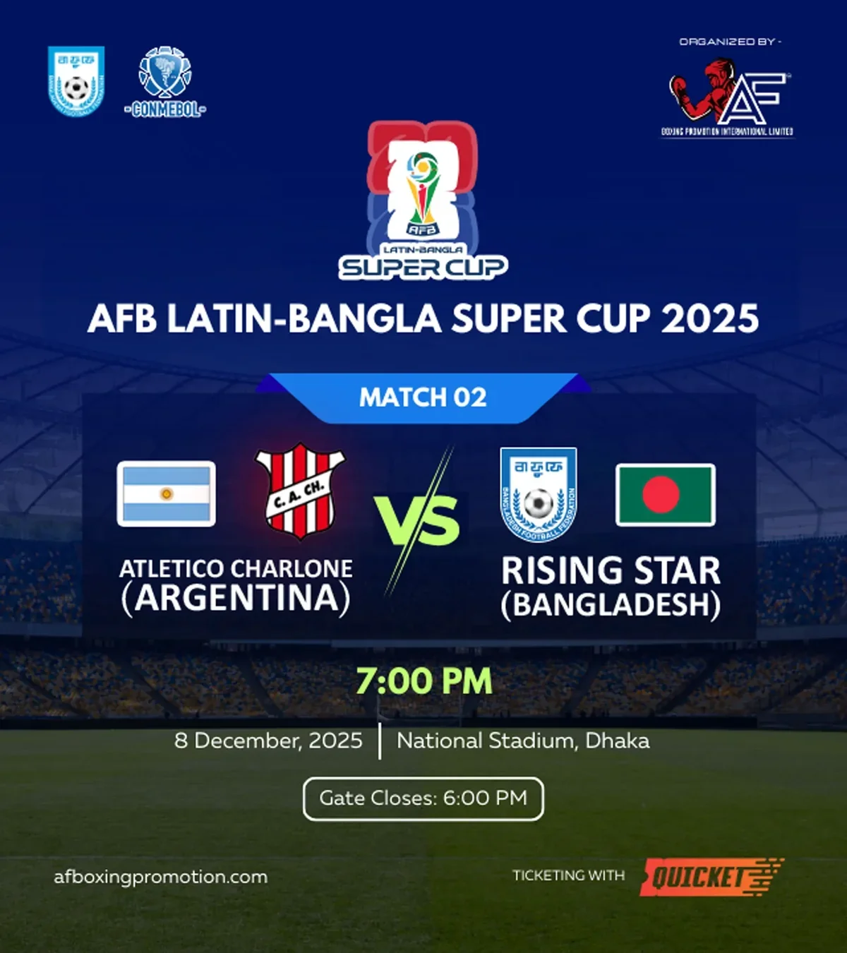 এএফবি ল্যাটিন-বাংলা সুপার কাপ ২০২৫ এর উত্তেজনাপূর্ণ ম্যাচে ৮ ডিসেম্বর ২০২৫ তারিখে মুখোমুখি হবে বাংলাদেশ এবং আর্জেন্টিনা। দুই দলের শক্তিশালী লাইনআপে এই ম্যাচটি হবে টুর্নামেন্টের অন্যতম আকর্ষণ। জাতীয় স্টেডিয়ামে অনুষ্ঠিত এই খেলা শুরু হবে সন্ধ্যা ৭:০০ টায় (UTC+6)। দুই দলের সমর্থকের উচ্ছ্বাসে স্টেডিয়াম ভরে উঠবে একটি স্মরণীয় ফুটবল সন্ধ্যার জন্য।