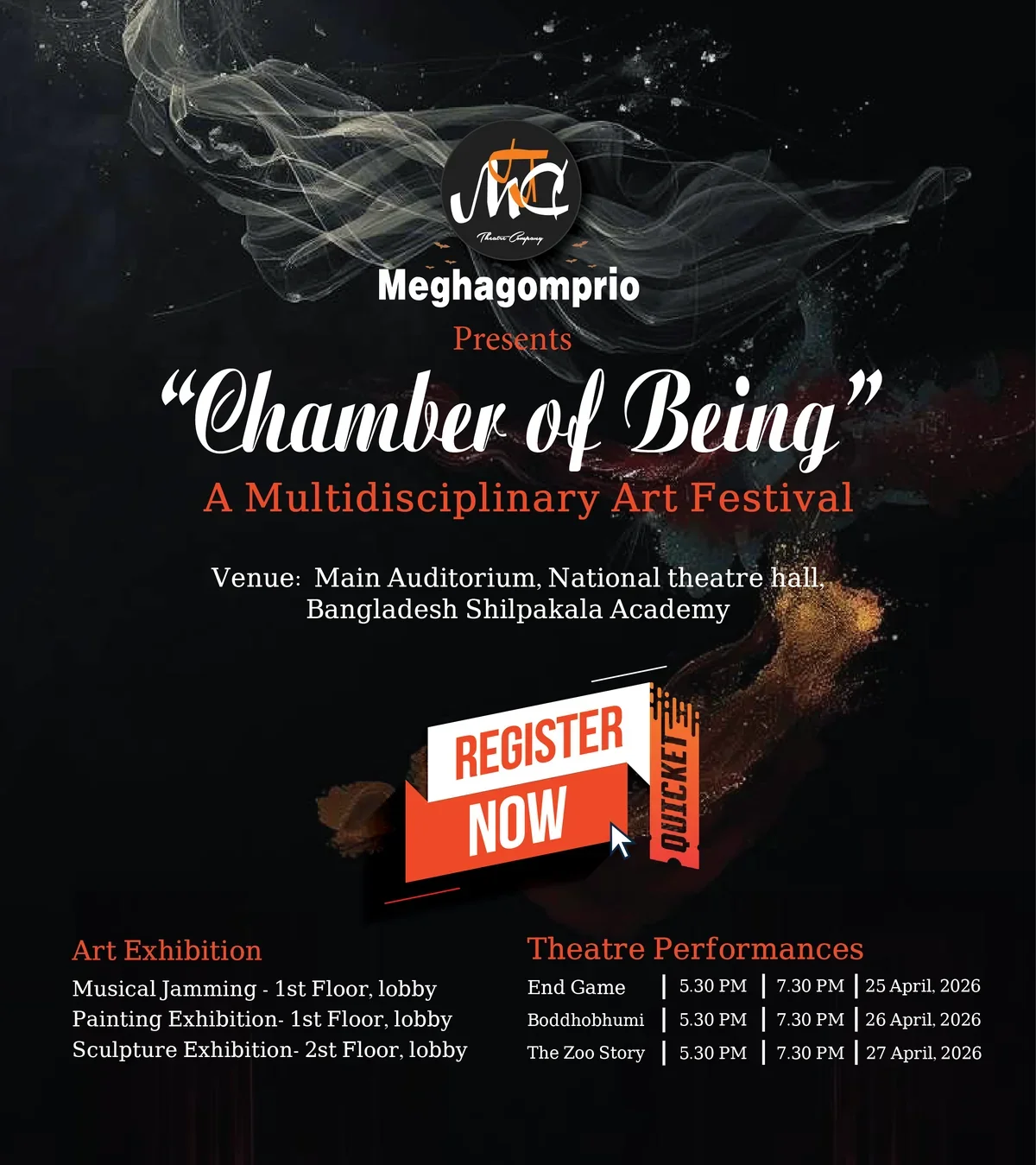 Meghagomprio Theatre Company arrives at the heart of the capital with a landmark three-day cultural journey. Experience a powerful fusion of theatre, contemporary visual arts, and live musical sessions crafted to challenge your perception and stir your soul.